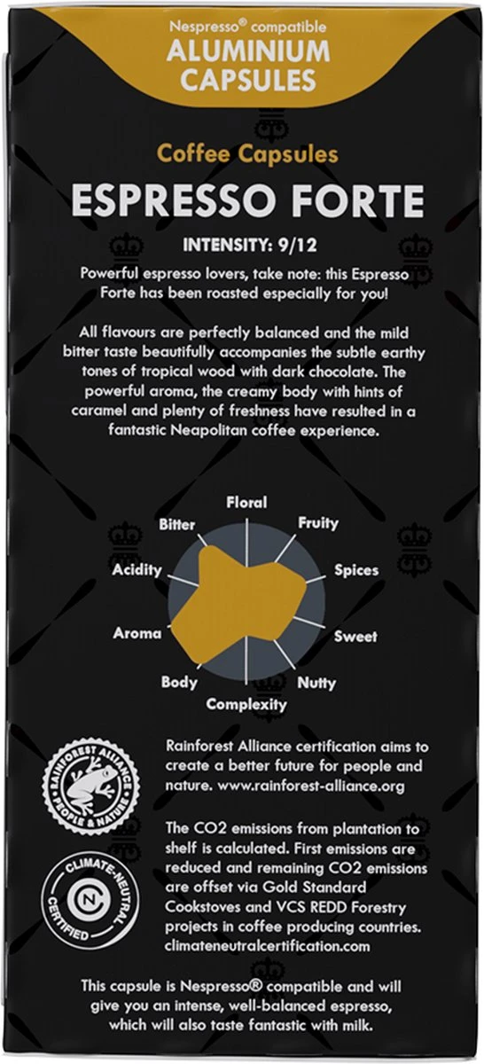 - Espresso Forte: 20 capsules, 100% Arabica, Intensiteit 9 van 12